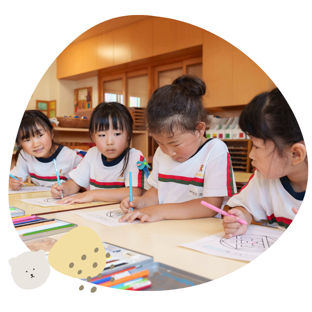 我が園では「自分で遊び、自分で考え、実行しやり遂げる」というマリアモンテッソーリの教育理念を大切にして幼児教育に当たっています。特に幼児教育は、人間の生涯で最も基本的人格形成の大切な時期であります。私たちは子どもたち一人一人の中に本来備わっている「自ら成長していける力」があると信じ、それを援助していくのが教育者の役目であると考えています。
